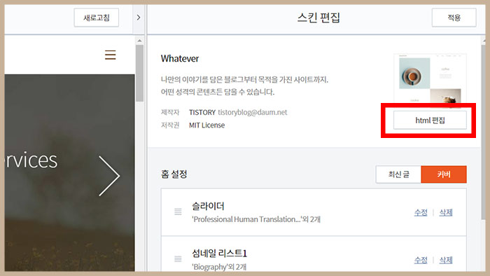 티스토리 관리자페이지→꾸미기→스킨편집→html편집 으로 갑니다.