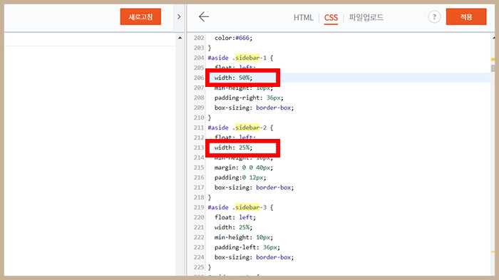 사이드바2의 가로길이는 25%로 바꿔줍니다.