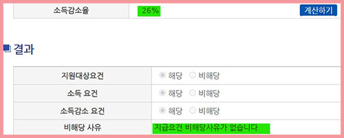 저는 가구소득방식 (건강보험료 합산방식)으로 모의 계산해보았는데요, ‘지급요건 비해당사유가 없다’고 나옵니다. 모의확인으로 신청 전에 미리 확인해보는 것도 좋을 것 같네요.