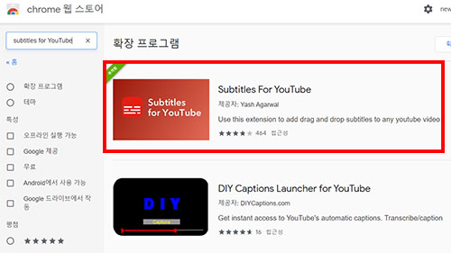 - 확장 프로그램 검색 창에서 Subtitles for YouTube 검색