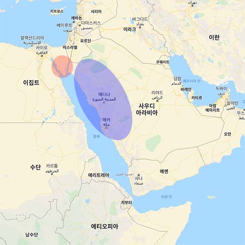 파란색은 아라비아 반도에서 시내산이 있을 것이라고 추정되는 곳입니다.