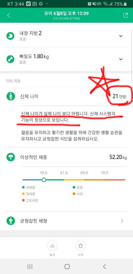 그런데 웬걸, 아주 건강한 상태라고 나왔어요. 신체나이는 21세! 오예!