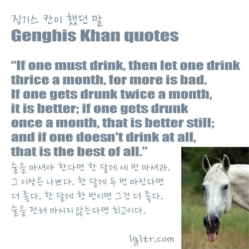 일찍 아버지를 여의고 풀뿌리와 들쥐를 잡아먹으며 가난하게 살았던 징기스 칸도 고난을 극복하고 밀레니엄 유명인사(악명으로)가 되었는데, 그 보다 많이 가진 우리들은 흙수저라고, 형편이 어렵다고 불평해서는 안됩니다!