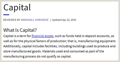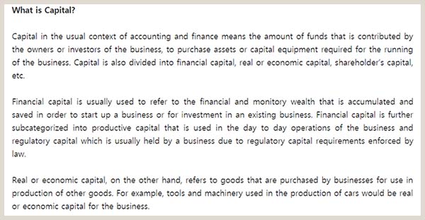 Capital 은 금융자산에 관한 용어로서 예금계좌에 보관된 자금뿐만 아니라 제조장비 같은 생산의 물리적 요소도 나타내는 용어라고 합니다. 상품을 생산하는 데 사용되거나 만들어진 제품을 저장하는 데 사용되는 건물과 같은 시설도 포함한다고 합니다.