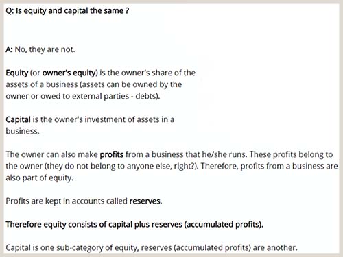 Equity는 사업의 자산에 대한 소유자의 지분이고, Capital은 자산에 대한 소유자의 투자입니다. 소유자가 자신이 운영하는 사업에서 이익을 얻을 경우 이 이익은 소유자에게 귀속됩니다. 따라서 사업에서 얻은 이익은 Equity의 일부가 됩니다. 이익은 준비금이라는 계정에 보관됩니다. 따라서 Equity는 Capital+준비금으로 구성됩니다.
