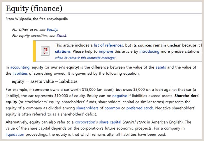 회계에서 Equity는 소유주지분이라고도 하는데, 자산의 가치와 부채의 가치의 차액이라고 하네요. 즉, [Equity = 자산가치 – 채무]로 표현할 수 있다고 합니다. 예를 들어 잘 설명하고 있군요. 읽어보시구요. 마음이 급하니 얼른 Capital을 찾아봅니다.