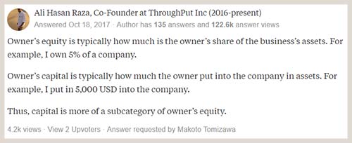Equity는 회사 자산에 대해 소유자가 얼마나 소유하고 있는가를 의미합니다. 예를 들어 나는 회사의 5%를 소유하고 있어. 이런 거요. Capital은 소유자가 회사의 자산에 얼마나 투자했는가를 의미하지요. 예를 들어 나는 회사에 5,000달러를 쑤셔 넣었어. 이런 거죠. 결론적으로 Capital은 Equity의 하위 범주라고 볼 수 있습니다.
