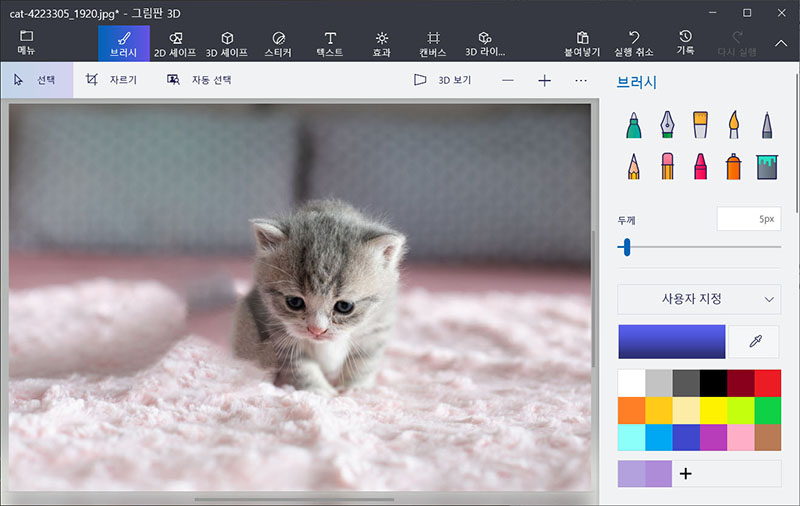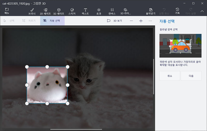 윈도우 10을 사용 중이라면 그림판3D가 무료로 제공됩니다. 훌륭하고 다양한 기능을 가진 유료 그림 편집 프로그램이 많이 있지만 그림판3D는 별다른 설치 없이 무료로 사용할 수 있다는 점이 매우 좋습니다. 게다가, 아주 섬세하진 못하지만 그래도 쉽고 간단하게 object 누끼를 따고, 지우고, 스티커로 만들기 등을 할 수 있습니다.