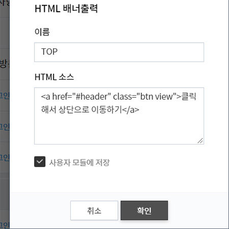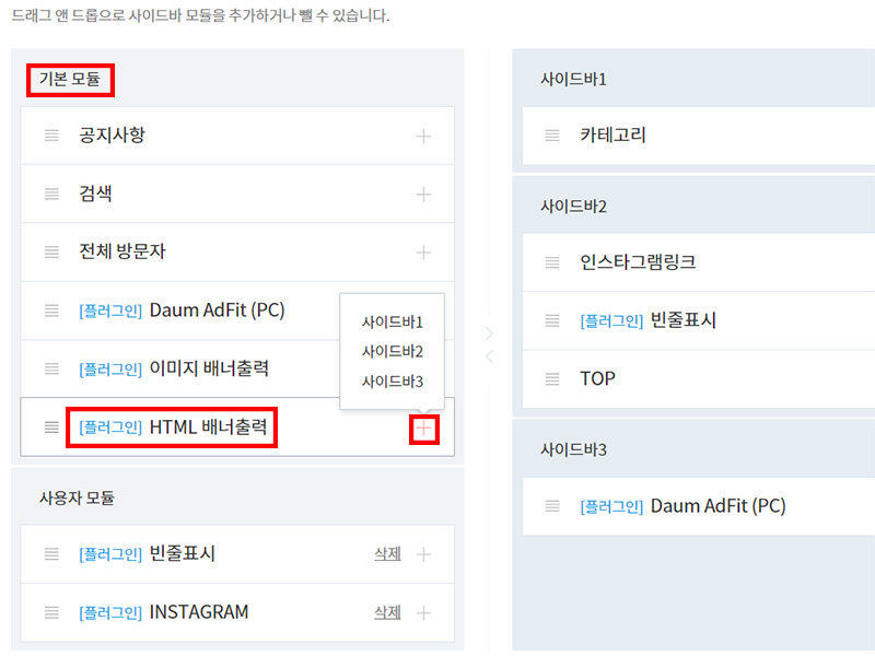- 기본 모듈 중에서 [[플러그인] HTML 배너출력] 옆에 있는 + 클릭