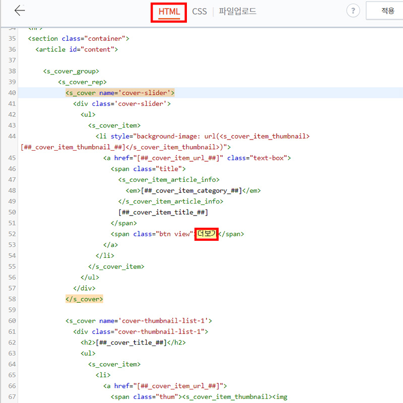 - 대략 52번 라인에 처음으로 등장하는 [더보기]는 슬라이더의 [더보기]입니다.