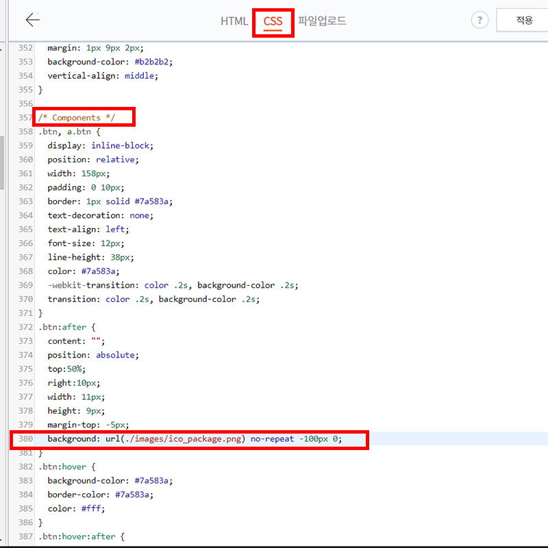 전부 삭제하기가 아까운 사람은 url(./images/ico_package.png)만 지우고 나머지는 살려줘도 될 것 같아요. 실험 결과는 동일하였습니다. 저는 깨끗하게 다 지워버렸어요. ㅎ