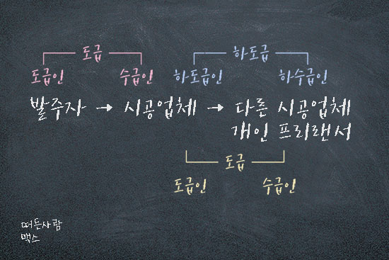 수급인이 '도급' 받은 일의 일부를 다시 '도급' 주는 경우도 있습니다. 하도급이라고 합니다. 이럴 경우 원도급의 수급인이 하도급의 도급인(하도급인)이 되고 하도급된 일을 완성하고 보수를 받는 자가 하도급의 수급인(하수급인)이 됩니다.